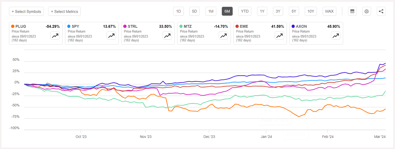 The chart below shows 6-month price-return performance of the top five gainers and SPY: