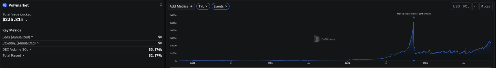• Polymarket gained popularity in 2024 during the U.S. elections, with its TVL recovering to $230 million by November 2025.