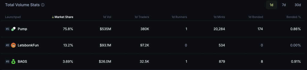 Data from Jupiter, the largest Solana-based DEX aggregator, Pump.fun recaptured the top spot in this market since early August and currently holds a 73% market share in daily total volumes over the past 7 days.