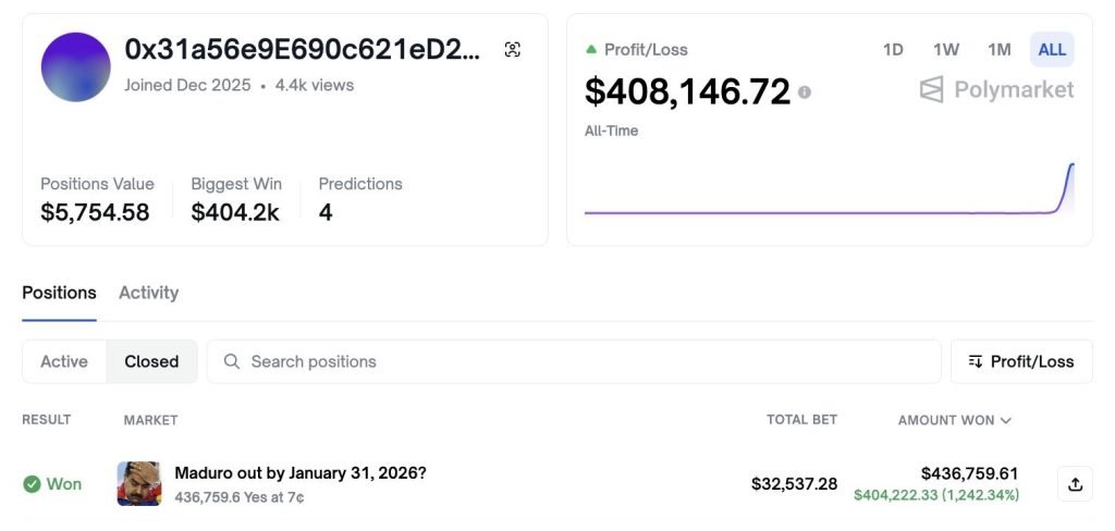 A newly created account wagered that Maduro would be removed from power by the end of January 2026, purchasing shares when the implied probability was in the low single digits.