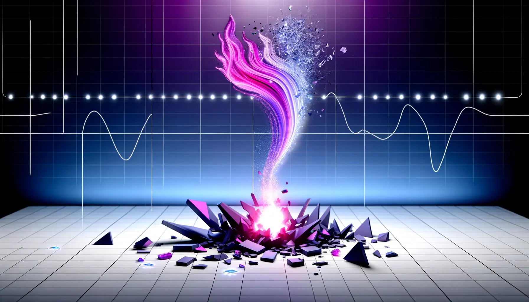 Phoenix energy rising from shattered crypto tokens in dramatic studio lighting with magenta gradients
