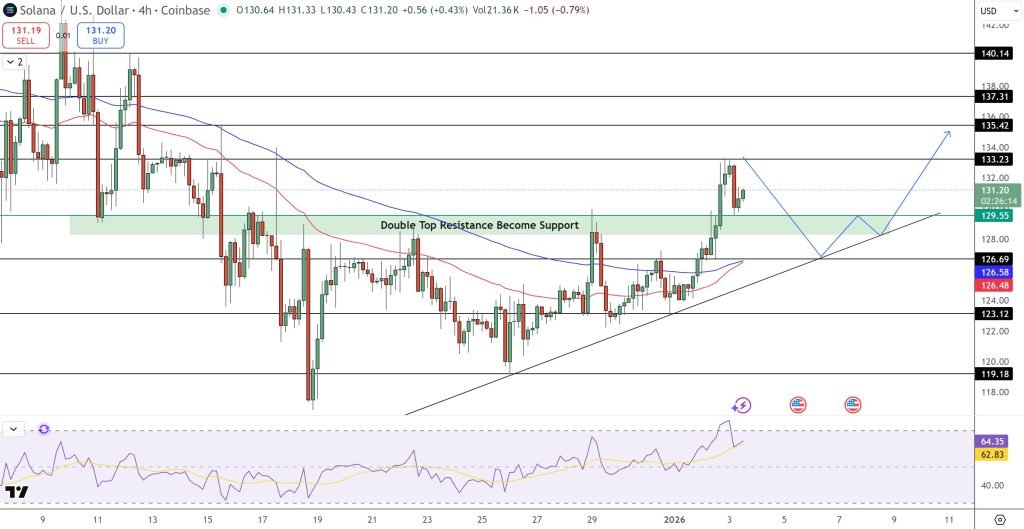 From a technical perspective, Solana price prediction seems bullish as SOL is holding firm above $129.55, which flipped from double-top resistance to new support. The 4-hour chart forms a rising trendline with consistent higher lows since mid-December, a pattern typically seen during accumulation phases.