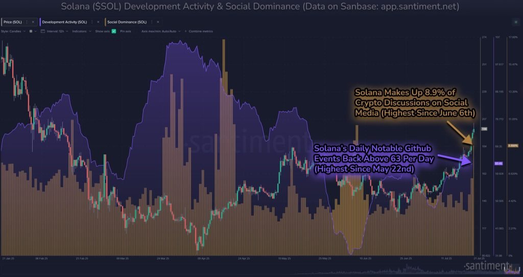 Social dominance has reached its highest point in 7 weeks, with 8.9% of social media chatter centered around Solana. Developer activity has also reached a two-month high as adoption rises.