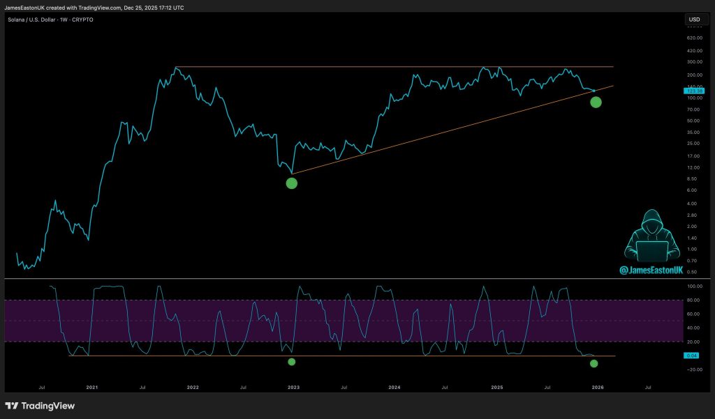 Analyst James Easton believes that as long as price stays above this wedge, the setup still supports a rally. What really stands out is the weekly RSI, which is actually lower now than it was at the bottom of the bear market, a condition that has historically lined up with strong upside moves.