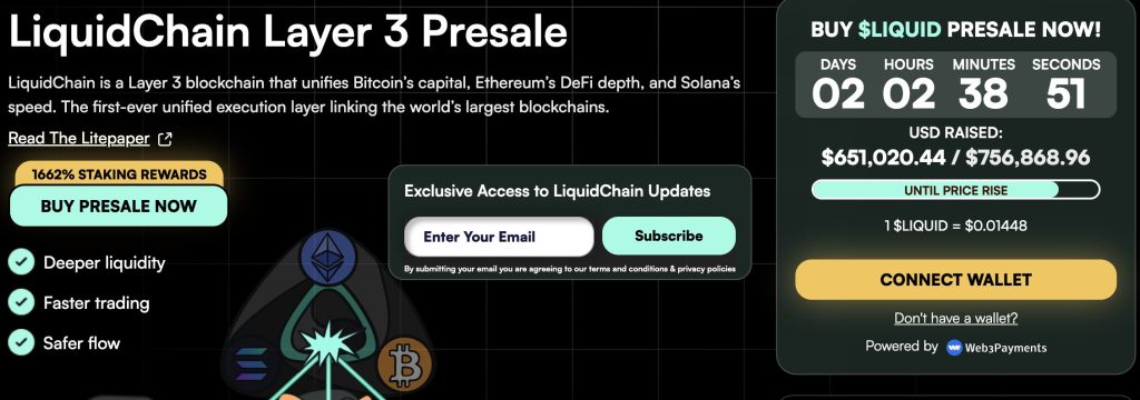 LiquidChain, a Solana Layer 3 infrastructure project targeting cross-chain throughput and settlement efficiency, is currently in presale.