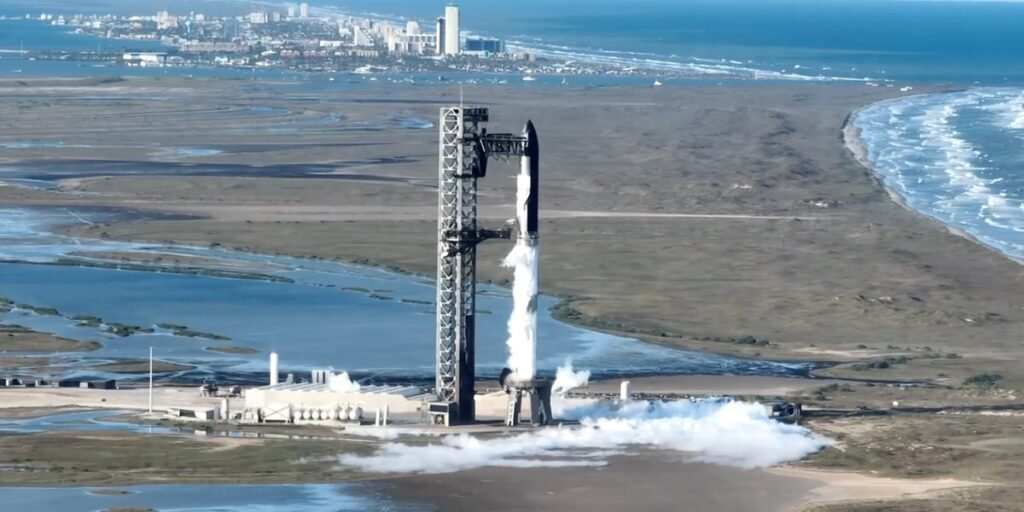 During Starship’s fifth test flight in October, SpaceX successfully caught the Super Heavy booster with a giant pair of metal arms, nicknamed “chopsticks,” that caught it before it reached the ground.