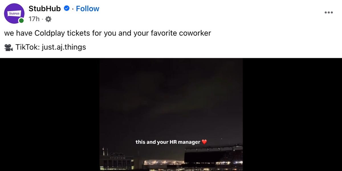 Tesla, Netflix, StubHub, and the Seattle Mariners are among a growing number of brands that have quickly seized on the viral internet video, in which two people who appear to be a tech CEO and his company’s head of HR were filmed embracing on a “kiss cam” at a Coldplay concert before quickly untangling and ducking out of frame.