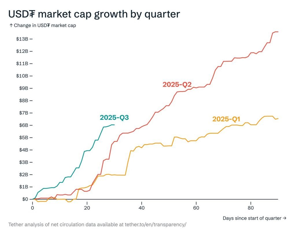 USDT’s circulating supply reached over $157 billion by the end of June, up by $20 billion since the start of the year. According to Tether, $13.4 billion of that was issued in Q2 alone, indicating growing demand across both emerging markets and digital finance platforms.