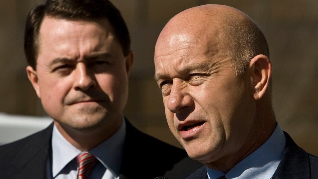 Texas Department of Agriculture Commissioner Todd Staples, left, looks on as Texas State Senator John Whitmire speaks during a press conference. (James Nielsen / Chronicle via Getty Images/File)