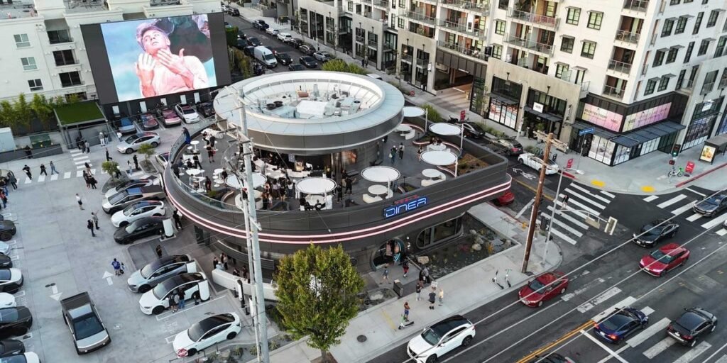 The diner sits on a corner of Los Angeles’s famous Santa Monica Boulevard, aka the historical Route 66, and it features sleek, curved edges, a rooftop patio overlooking two 45-foot-tall drive-in screens, and retro neon signs.