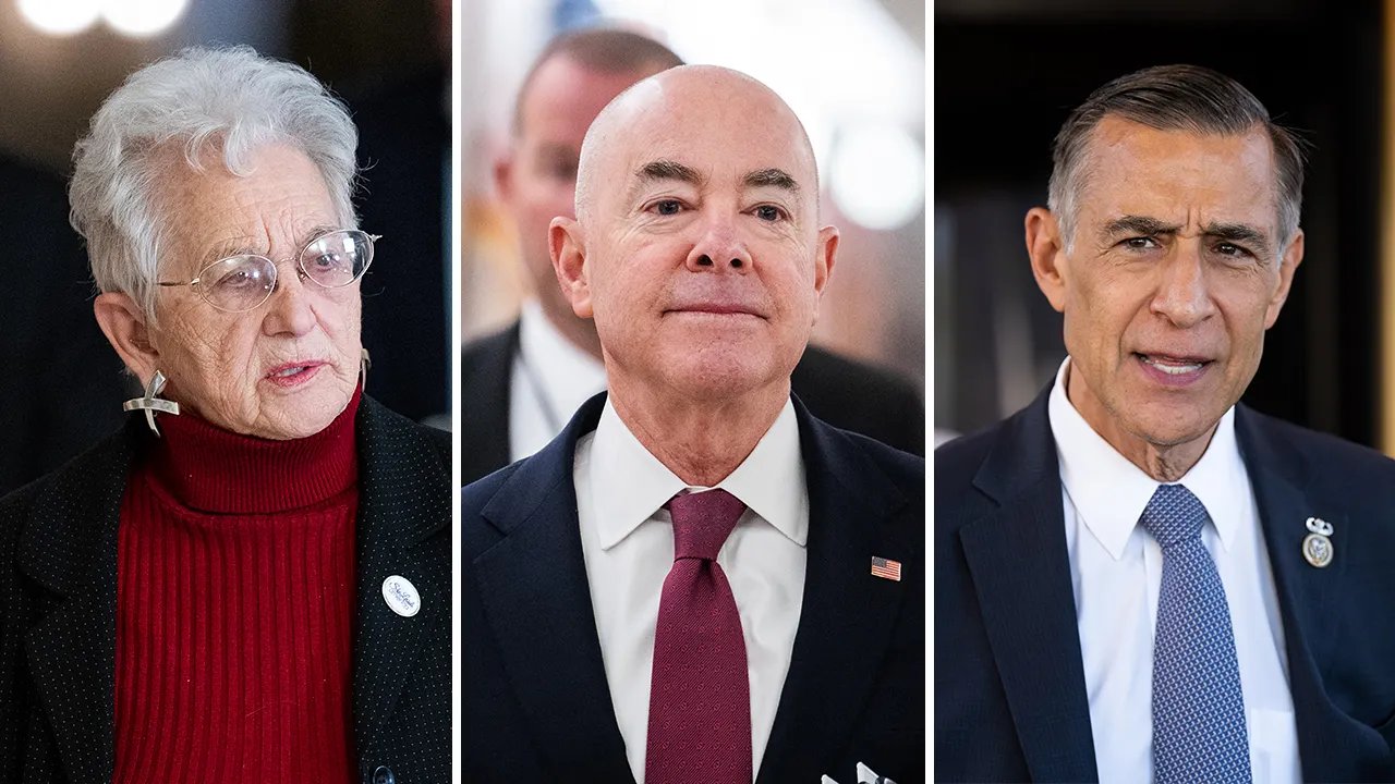 Pictured from left to right: Rep. Virginia Foxx, R-N.C., Secretary Alejandro Mayorkas, and Rep. Darrell Issa, R-Calif. (Getty Images)