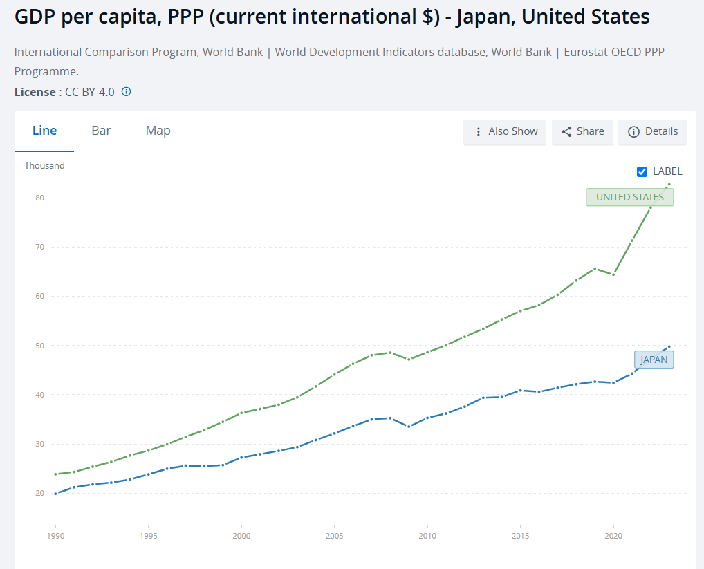 Well here is data on GDP per capita in real terms in Japan and the United States since 1990. This is vindication???!