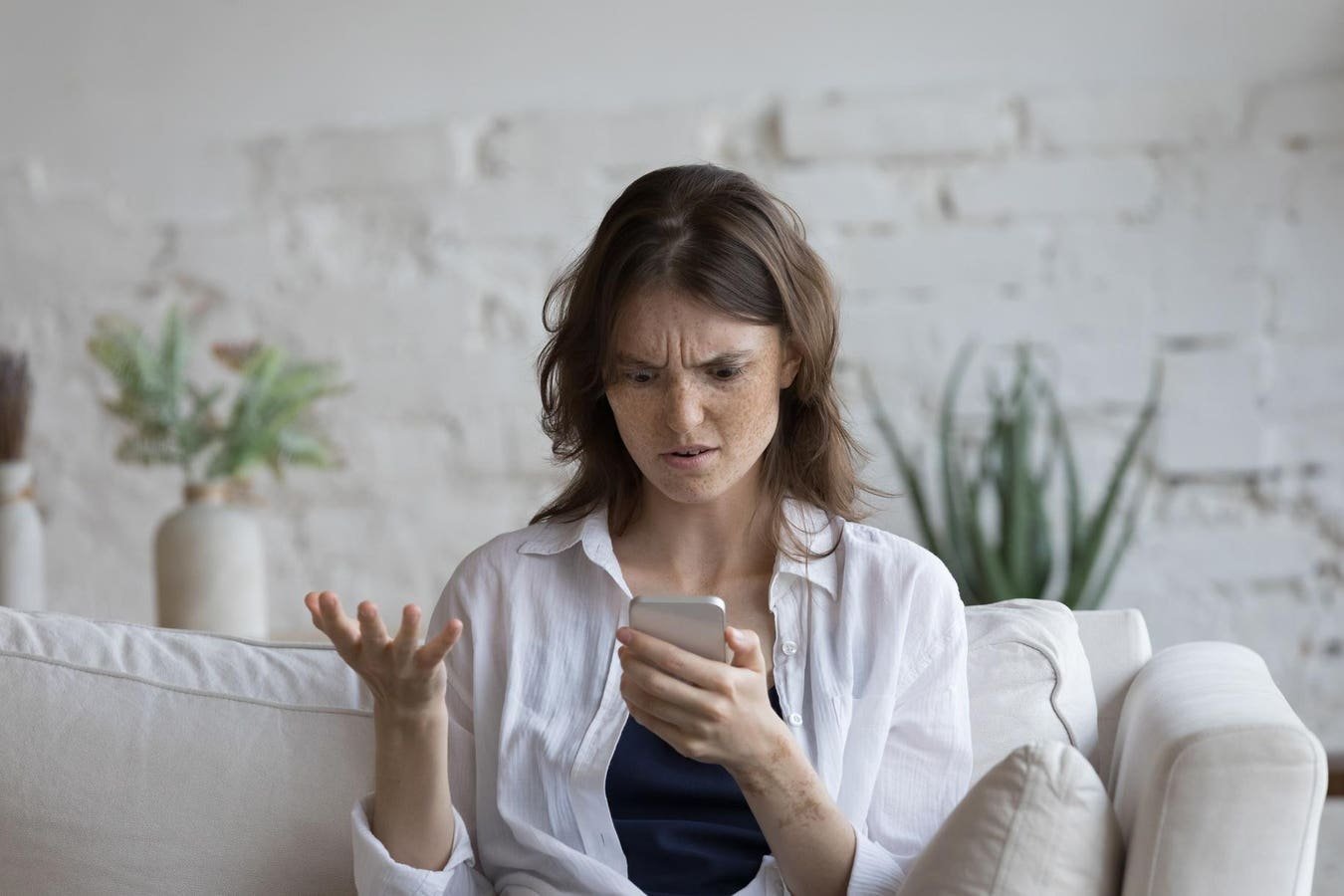 Young woman feels annoyed having problems with broken smartphone sit on sofa staring at smartphone … [+] read awful news in sms. Damaged gadget, lost Wi-Fi connection, need device repair due malware concept