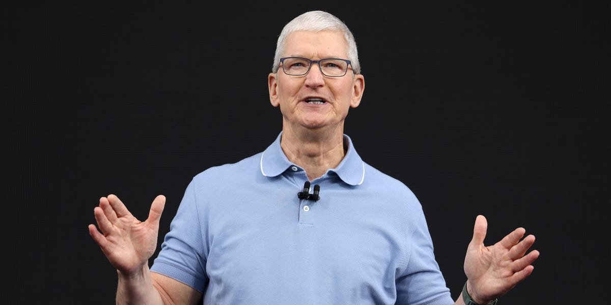 Tim Cook talking and pointing.