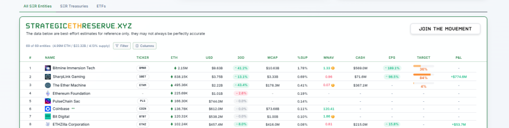 According to treasury reserve data, corporate and institutional entities now collectively hold about 4.99 million ETH worth $22.2 billion, representing 4.13% of the token’s circulating supply.