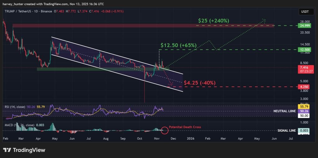 The controversy has derailed TRUMP’s best attempt at breaking out of a six-month descending channel, with price now testing a crucial demand zone around $7.35.