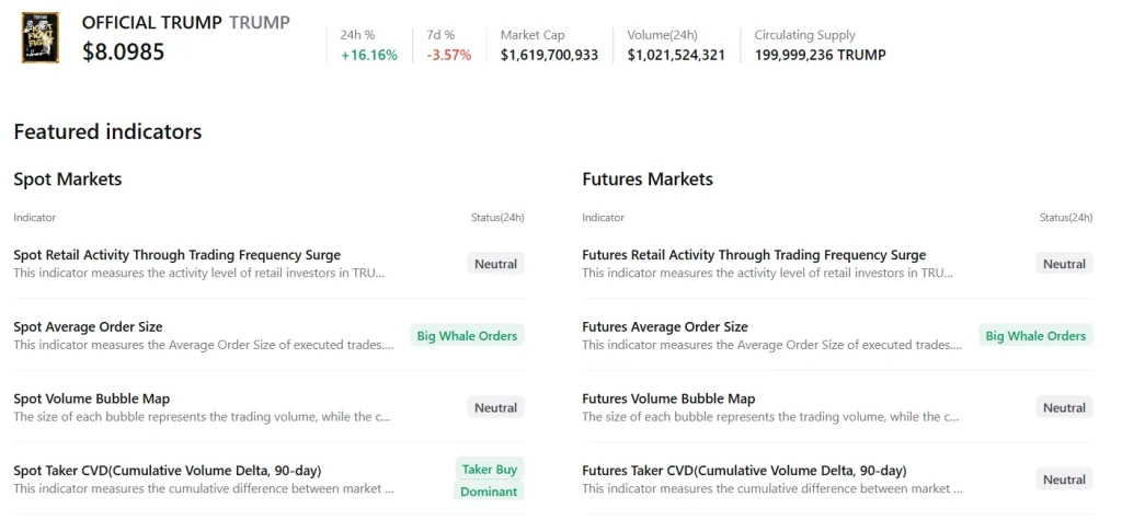 Data from CryptoQuant shows that whales have been placing large bets on TRUMP across both spot and futures markets, likely anticipating a resolution to the U.S. government shutdown.