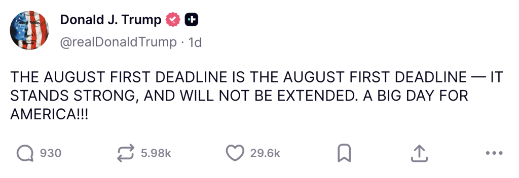 But the president made one thing clear: his deadline of 1 August was not going to be extended, meaning countries that had failed to reach an agreement with Washington by then would soon take a severe financial hit.