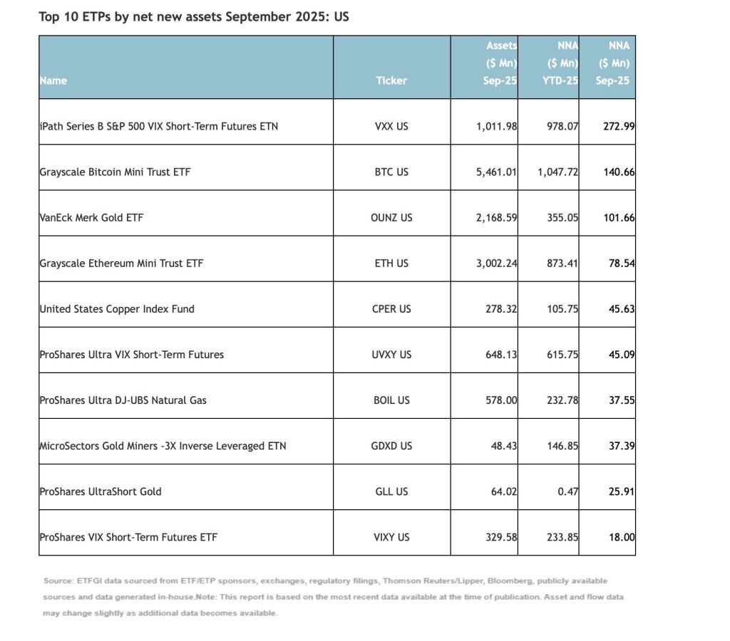 The top 10 U.S. exchange-traded products (ETPs) by net new assets collectively added $803 million during September. The largest single inflow came from the iPath Series B S&P 500 VIX Short-Term Futures ETN (VXX US), which pulled in $272.99 million, reflecting renewed hedging demand as equity volatility resurfaced.