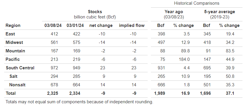 - Stocks for the week ended March 8, 2024 were 2,325 Bcf vs. 2,334 Bcf for the week ended March 1, 2024.