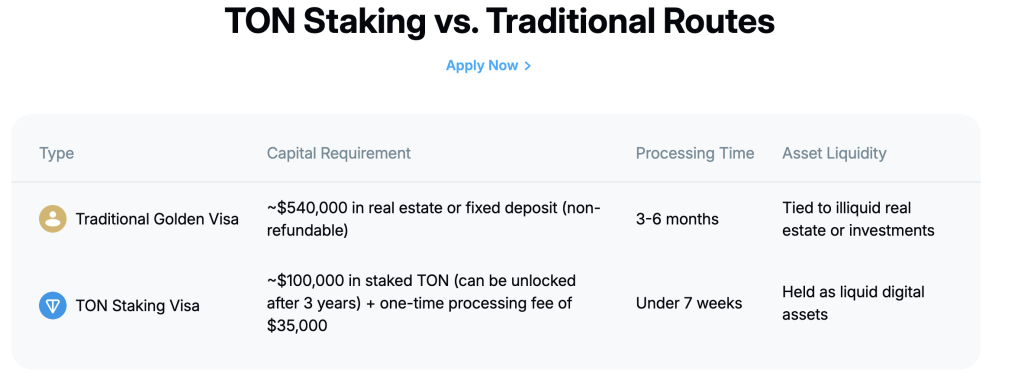 Applicants who stake $100,000 worth of TON for three years and pay a one-time $35,000 processing fee would be eligible for a 10-year golden visa, TON said.