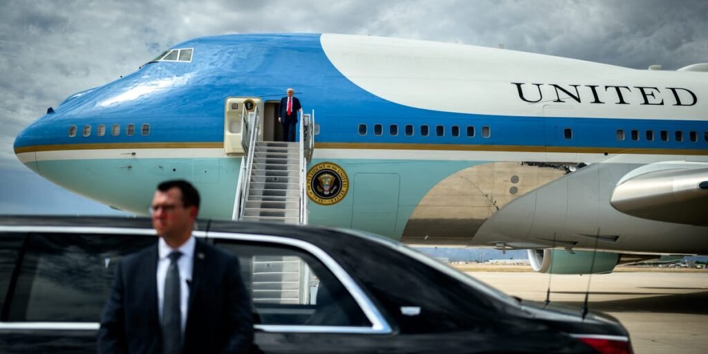 Trump’s Air Force One jet, a VC-25A, measures 231 feet long and features 4,000 square feet of offices, rest areas, an executive stateroom with a full bathroom and dressing room, and a conference room. It can hold 30 crew members and 71 passengers.