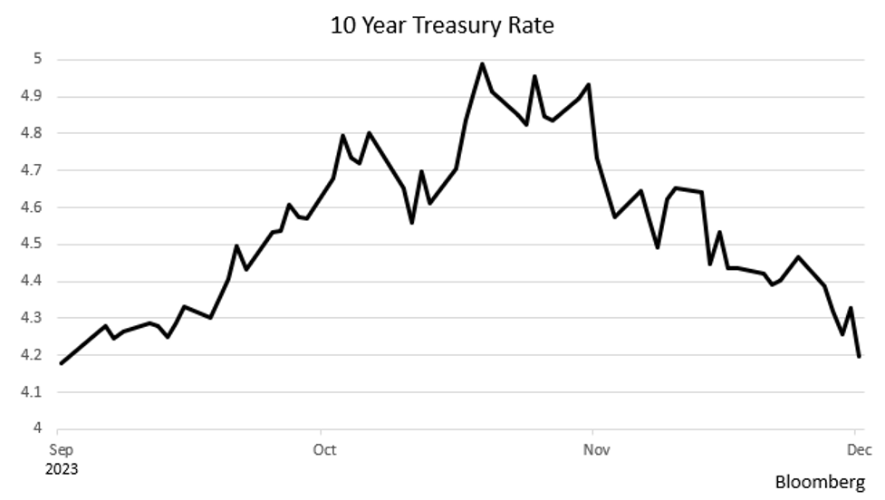 The fact that FOMC members, in recent public comments, have acknowledged that monetary policy appears to be working (the recent inflation data have come in lower than anticipated) has been interpreted by markets to mean that the peak in interest rates is in, and that the next policy move will be to lower rates. Wall Street’s odds for this have recently moved from a rate cut at the 2024 June 12th meetings to the May 1st conclave. Note in the chart at the top of this blog that the yield on the 10-Yr. Treasury has come full cycle from early September to December 1st. At the Fed’s September meetings, in order to manage market expectations so that financial conditions stayed tight, the Fed emphasized its Higher for Longer mantra. And that caused the 10-Yr. Treasury yield to spike from 4.2% to 5.0% by late October. Since then, as inflation has melted and FOMC public comments have acknowledged that additional rate hikes are improbable, 10-Yr. yields have returned to that 4.2% level where they were prior to September’s (Higher for Longer) meeting.
