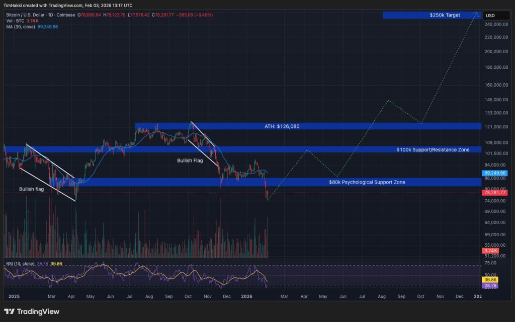 Bitcoin ($BTC), the world’s first cryptocurrency and the largest by market value, set a new ATH of $126,080 on October 6. Since then, it has declined by roughly 38% and now trades near $78,200 following two sharp market sell-offs driven by global geopolitical uncertainty.
