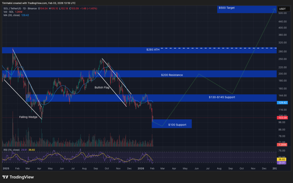 After a sharp correction late in 2025, SOL spent recent months consolidating around a key support zone and currently trades near $103. A broader recovery is likely to depend on Bitcoin reclaiming the $100,000 level, a milestone many analysts expect will happen before midyear.