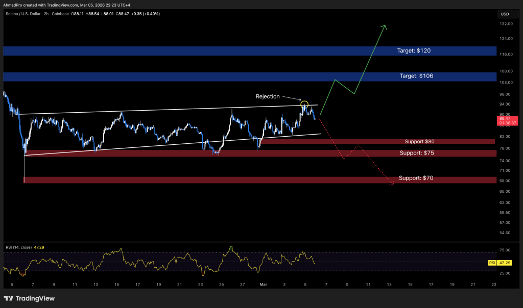 If buyers step back in and push SOL above that trendline, the next targets are near $106 and possibly $120 if momentum continues to expand.