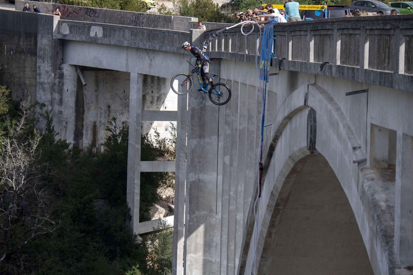 French athlete and former Mountain Bike champion Aurelien Fontenoy makes a bungee jump on his bike … [+] from the Artuby bridge, the highest bridge in Europe with 182 m of height, near Comps-sur-Artuby on July 24, 2021, southeastern France. – (Photo by Christophe SIMON / AFP) (Photo by CHRISTOPHE SIMON/AFP via Getty Images)