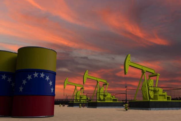 Nice pumpjack oil extraction and cloudy sky in sunset with the Venezuela flag on oil barrels 3D rendering