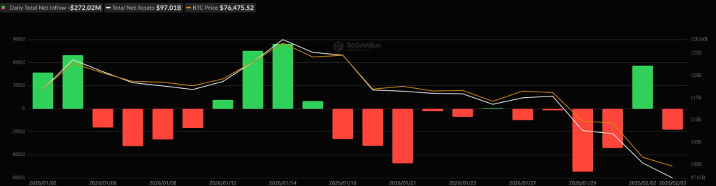 • US spot BTC ETFs saw outflows of $272.02 million, spot ETH ETFs posted inflows of $14.06 million;