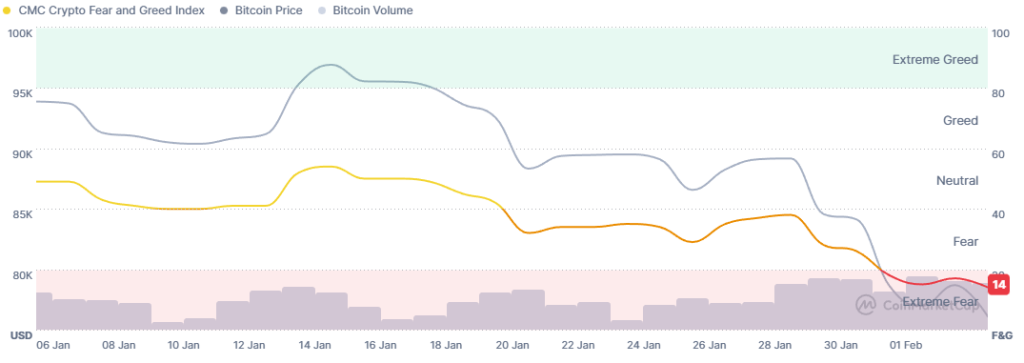 The crypto fear and greed index stands at 14 today, compared to 17 we saw at the same time yesterday. This is the lowest level since late November 2025.