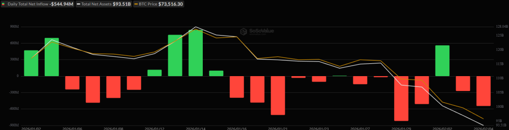 The US BTC spot exchange-traded funds (ETFs) closed the Wednesday session lower, with $544.94 million in negative flows. With this, the total net inflow fell below $55 billion to the current $54.75 billion.