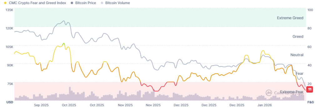 The crypto fear and greed index now stands at 11, down from 14 seen a day ago. This is the lowest level since 22 November 2025.