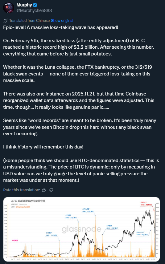On-chain analyst Murphy defined this as capitulation, arguing that the scale of loss-taking surpassed what the market absorbed during some of its strongest shocks.