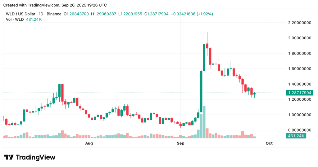 Technical analysis reveals WLD testing key support around $1.28 within a long-term descending triangle pattern from March 2024 highs near $11.70.