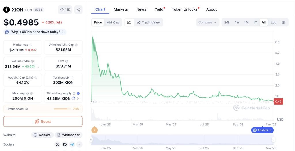 While XION has made strides in building institutional partnerships and real-world use cases, its token has yet to gain strong market momentum. Currently trading at around $0.49, XION’s market capitalization sits near $21 million, with a fully diluted valuation (FDV) of roughly $100 million, according to CoinMarketCap.