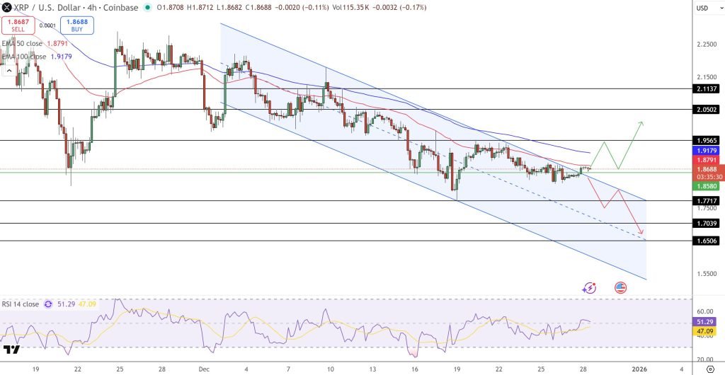 On the 4-hour chart, XRP is still stuck inside a descending channel that has been dictating price action since that $2.11 peak earlier this month. Lower highs are still forming, but the channel’s slope is flatter than before, a sign that sellers are losing their grip.