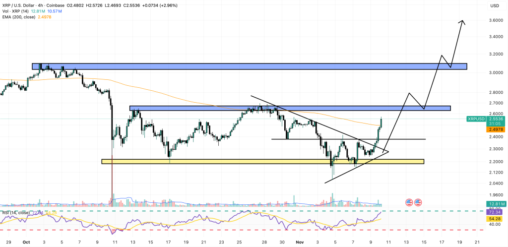 The 4-hour chart shows that XRP broke a symmetrical triangle that had been forming since the token started its latest downtrend in late October.