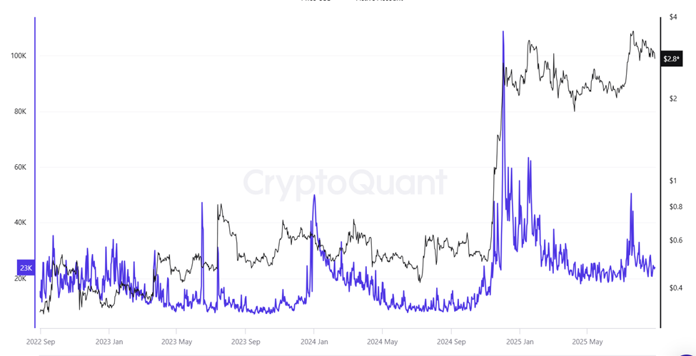 XRP’s fundamentals have also softened. Active addresses on the XRP Ledger fell from roughly 50,000 in mid-July to just 24,000 today, according to CryptoQuant, highlighting weaker network activity.