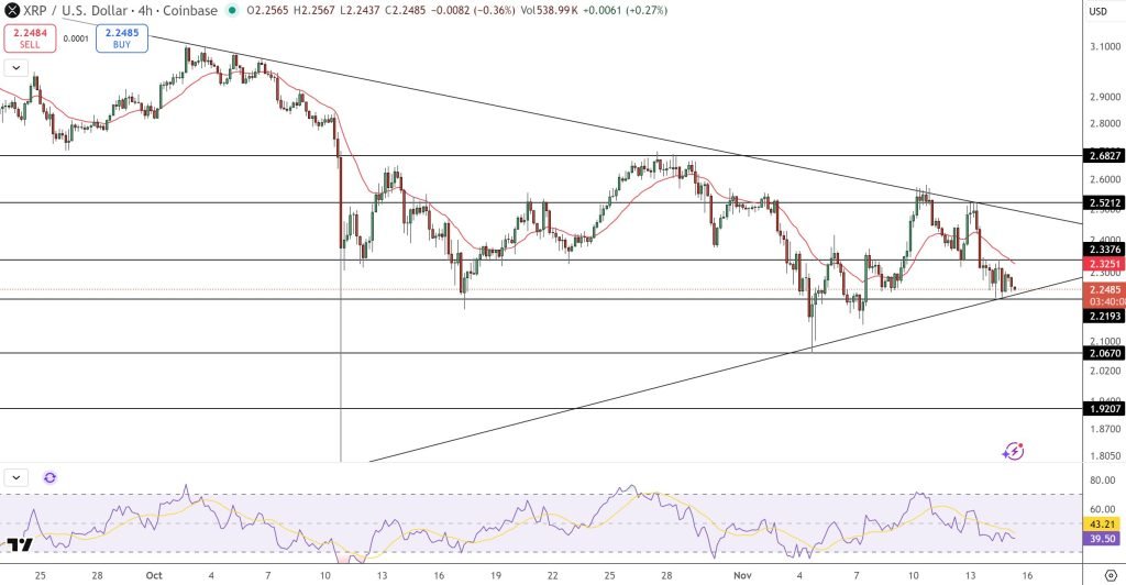 On the 4-hour chart, XRP remains below the 20-EMA, signaling short-term weakness. The RSI at 39 shows buyers haven’t stepped in with conviction, while long upper wicks on recent candles indicate consistent profit-taking.