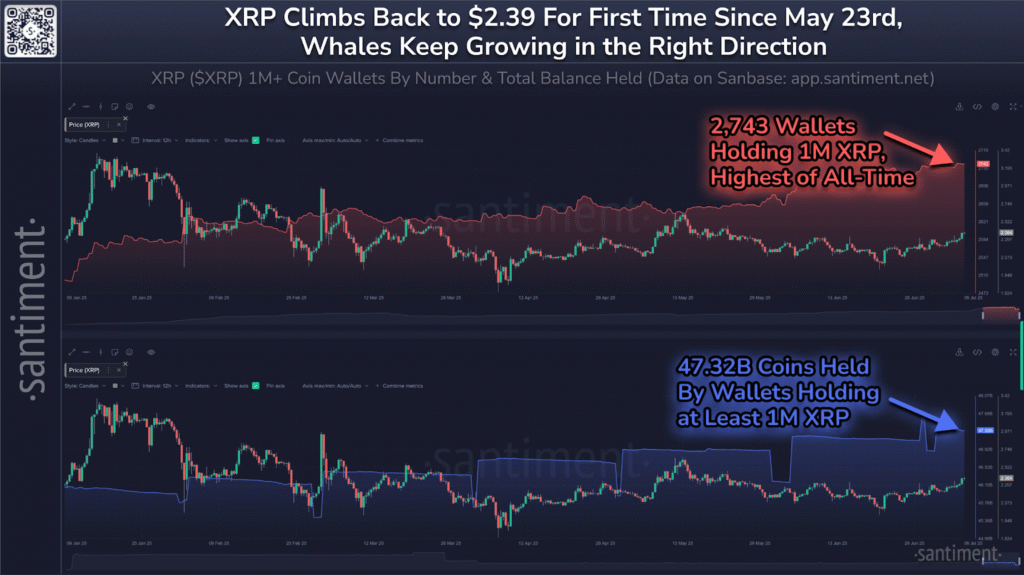 This breakout came at a time when whale wallets holding over 1 million XRP now account for 47.32 billion tokens.