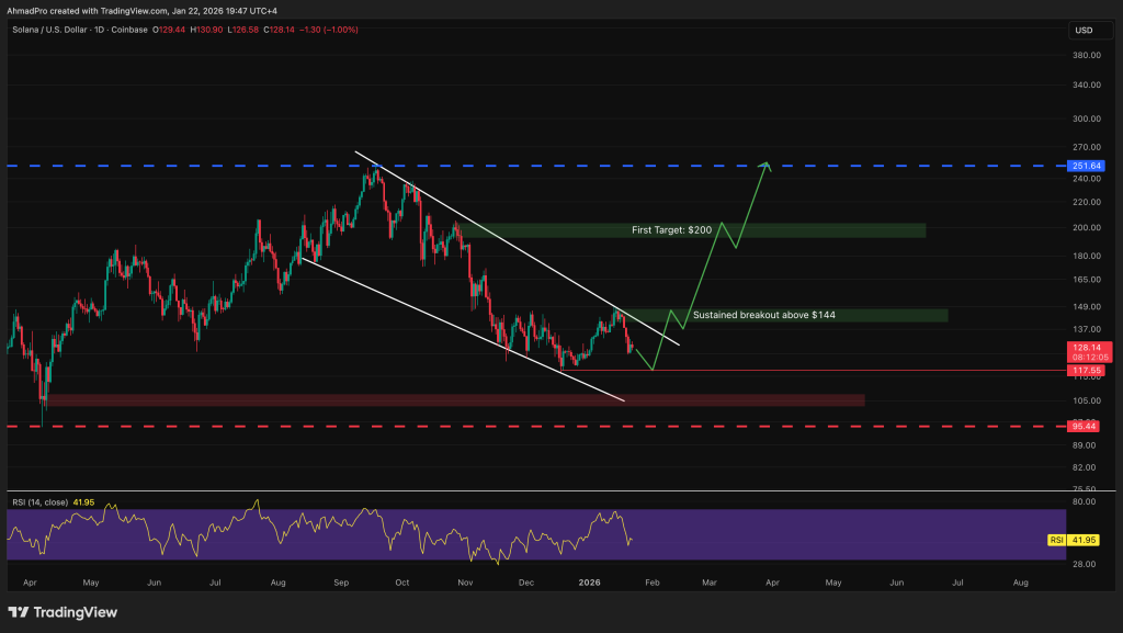 The level bulls need to reclaim is $144, since it lines up with channel resistance and prior supply. A clean break and hold above $144 would be the first real sign of strength and could open the door toward $200, with a bigger resistance waiting near $250.