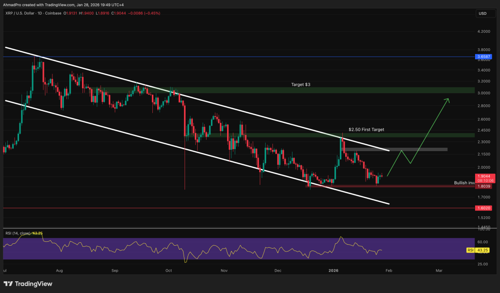 XRP is still stuck inside a descending channel that has been controlling price for months, with the latest bounce coming off the lower boundary around the $1.80 to $1.85 demand zone.