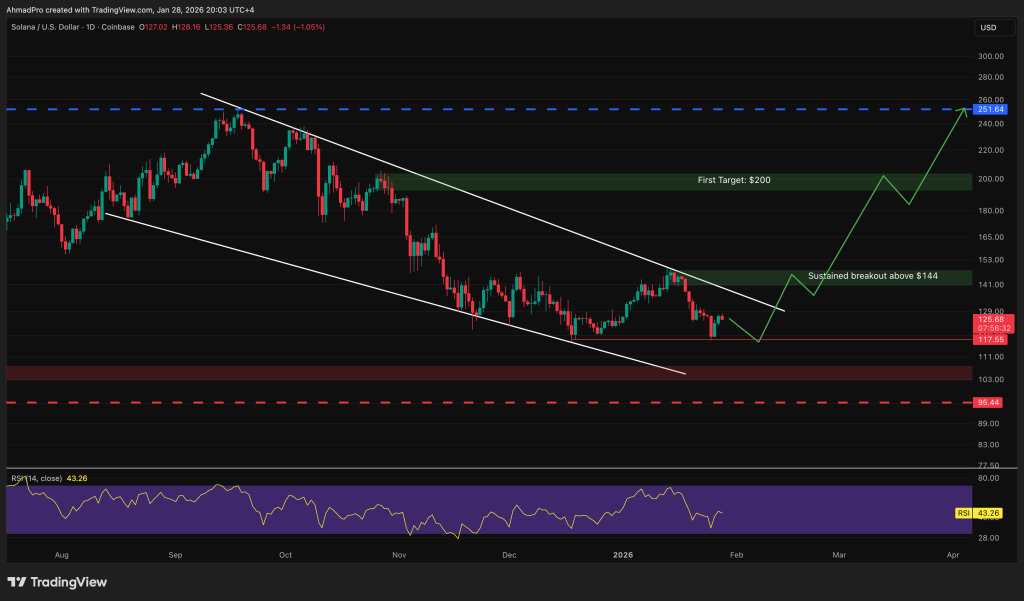 Solana price is still trading inside a clean descending channel, with the price recently bouncing off the lower boundary around the $118 to $120 support zone.