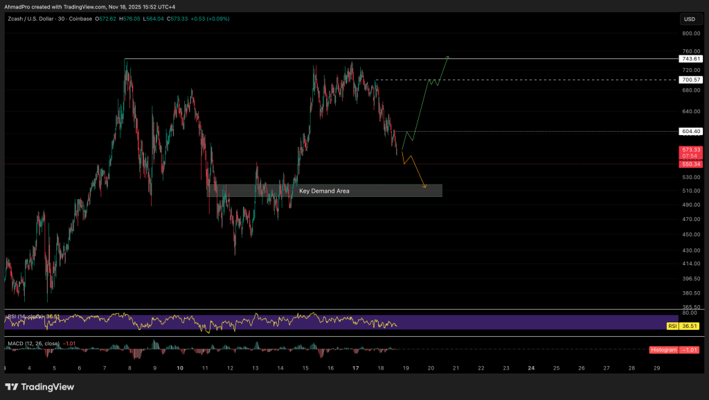 ZCASH has been dropping lately alongside the market. It dumped hard from that $743 peak. Right now, it’s sliding toward what looks like a really important support zone between $500-$530.